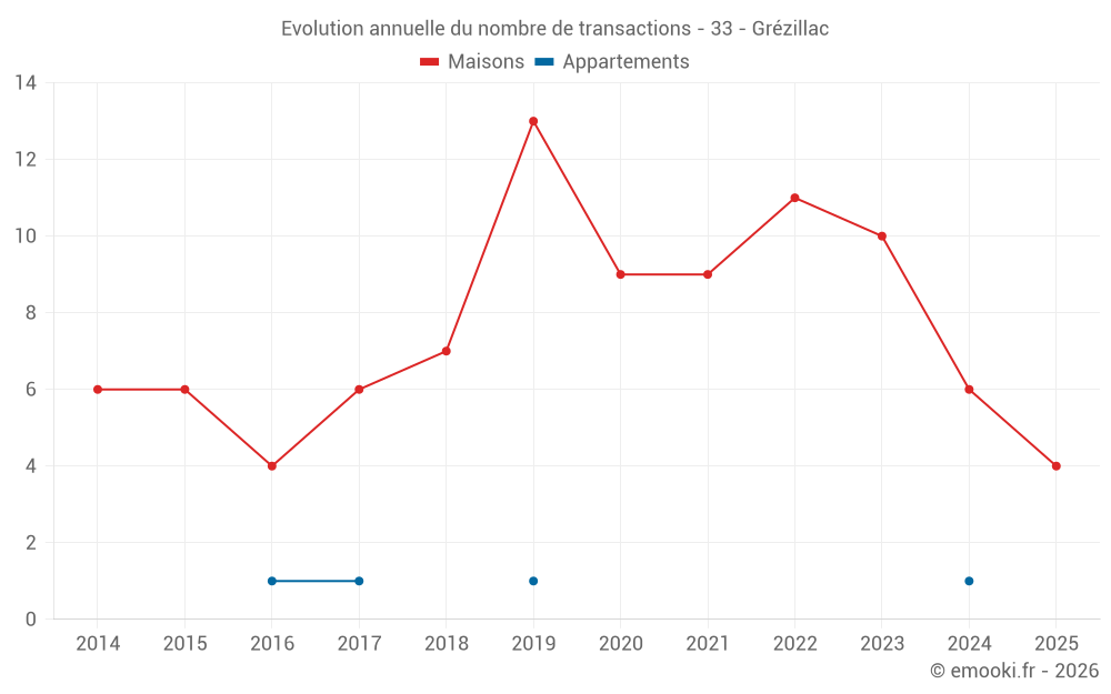 Le prix médian sur les 15 transactions de maisons des 24 derniers mois dans la commune de Grézillac était de 1 714 € par mètre carré pour une valeur foncière médiane de 147 000 €. Sur cette période 60% des transactions se sont situées entre 1 270 et 2 142 € par mètre carré (du 2ème au 8ème déciles).