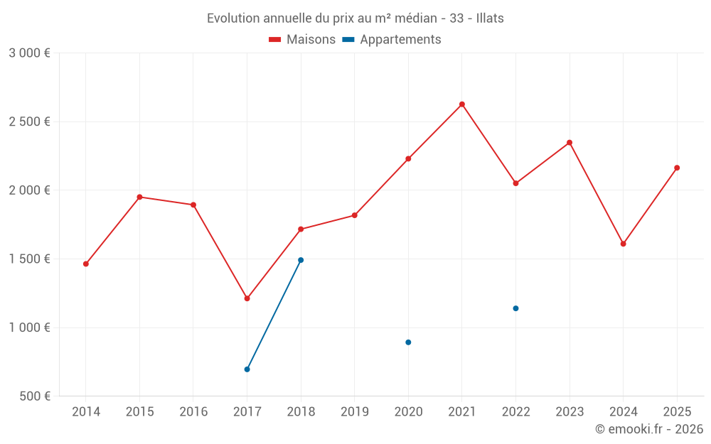 Le prix médian sur les 17 transactions de maisons des 24 derniers mois dans la commune d'Illats était de 2 103 € par mètre carré pour une valeur foncière médiane de 205 000 €. Sur cette période 60% des transactions se sont situées entre 1 115 et 2 564 € par mètre carré (du 2ème au 8ème déciles).