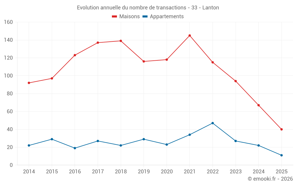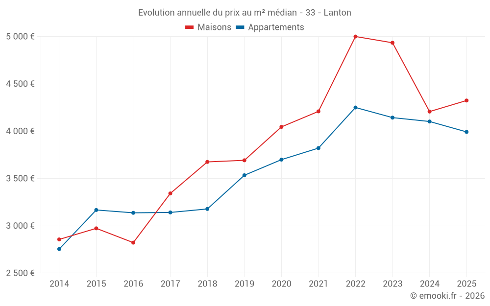 Le prix médian sur les 40 transactions de maisons des 6 derniers mois dans la commune de Lanton était de 4 324 € par mètre carré pour une valeur foncière médiane de 344 375 €. Sur cette période 60% des transactions se sont situées entre 3 395 et 5 000 € par mètre carré (du 2ème au 8ème déciles).