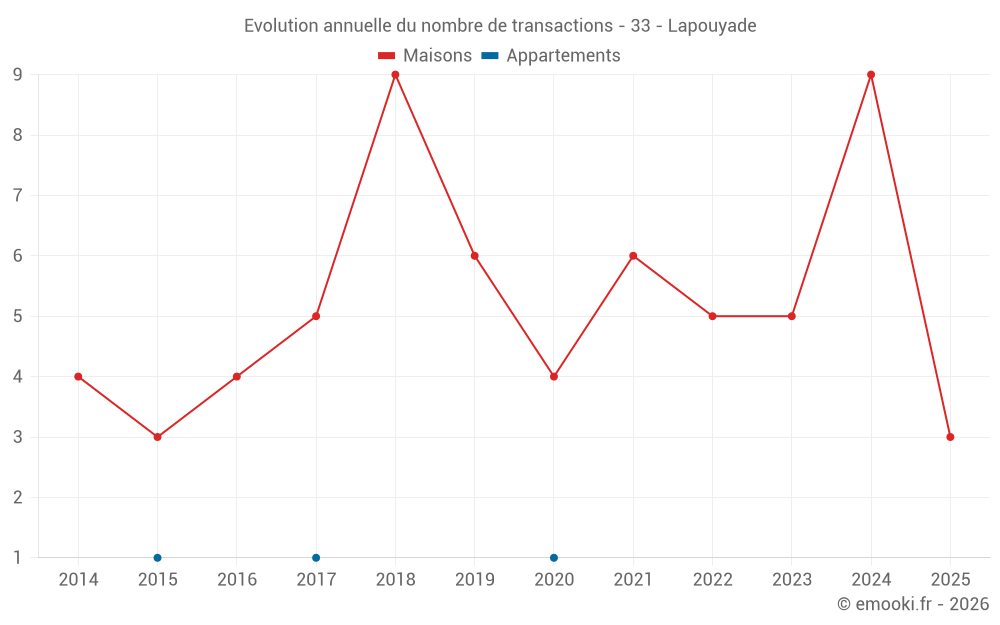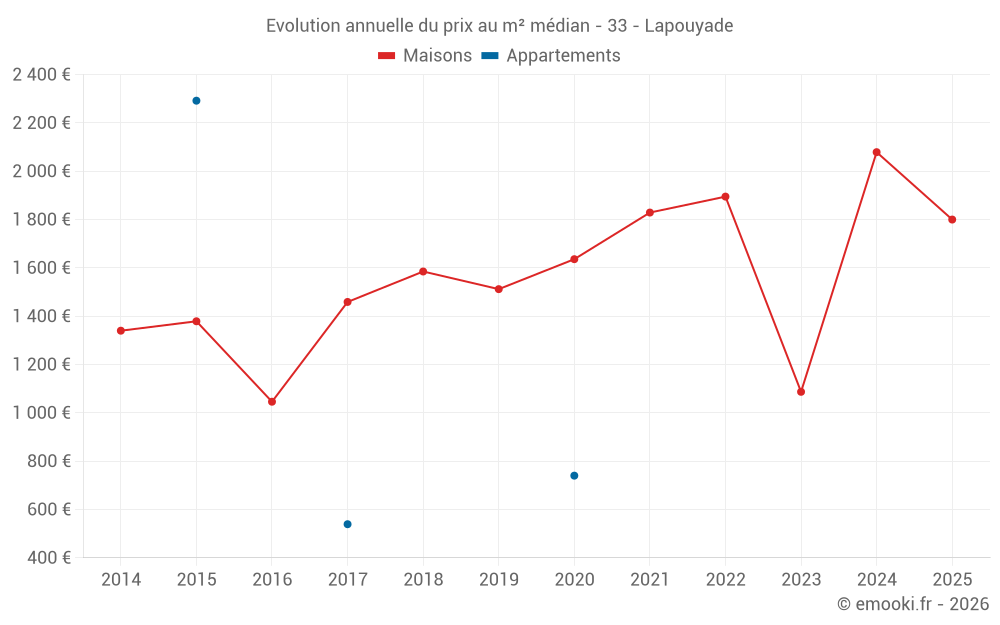 Le prix médian sur les 14 transactions de maisons des 24 derniers mois dans la commune de Lapouyade était de 1 898 € par mètre carré pour une valeur foncière médiane de 200 012 €. Sur cette période 60% des transactions se sont situées entre 1 437 et 2 170 € par mètre carré (du 2ème au 8ème déciles).