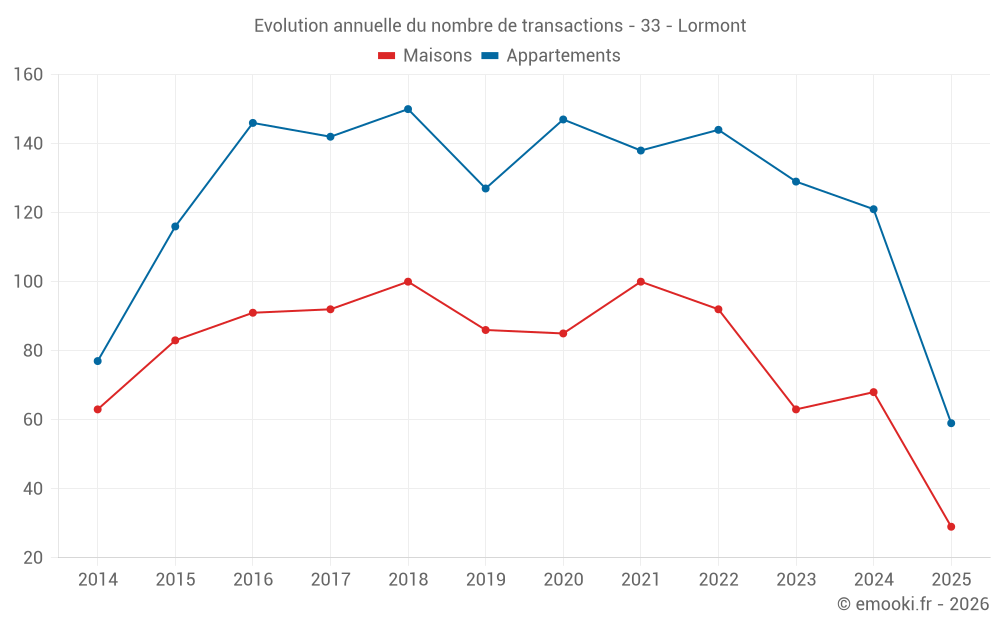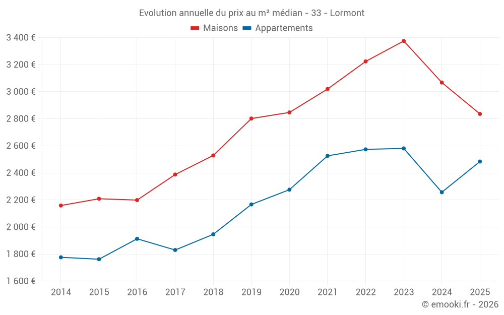 Le prix médian sur les 29 transactions de maisons des 6 derniers mois dans la commune de Lormont était de 2 836 € par mètre carré pour une valeur foncière médiane de 230 000 €. Sur cette période 60% des transactions se sont situées entre 2 222 et 3 274 € par mètre carré (du 2ème au 8ème déciles).