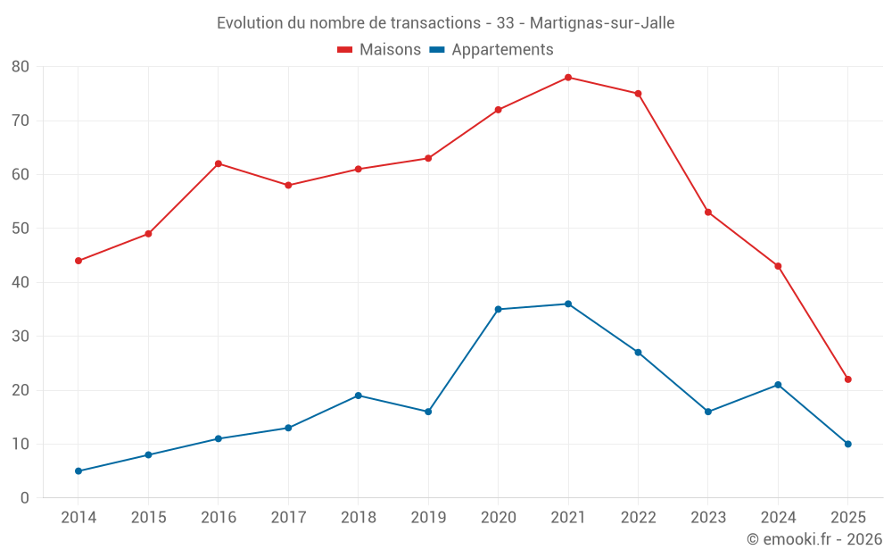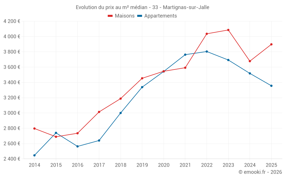 Le prix médian sur les 22 transactions de maisons des 6 derniers mois dans la commune de Martignas-sur-Jalle était de 3 898 € par mètre carré pour une valeur foncière médiane de 371 500 €. Sur cette période 60% des transactions se sont situées entre 3 435 et 4 189 € par mètre carré (du 2ème au 8ème déciles).