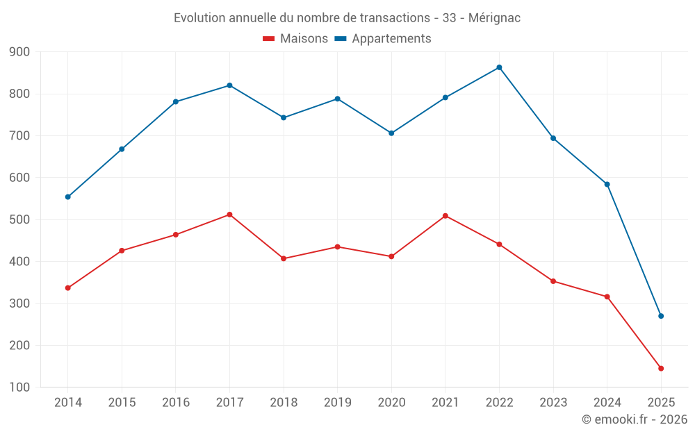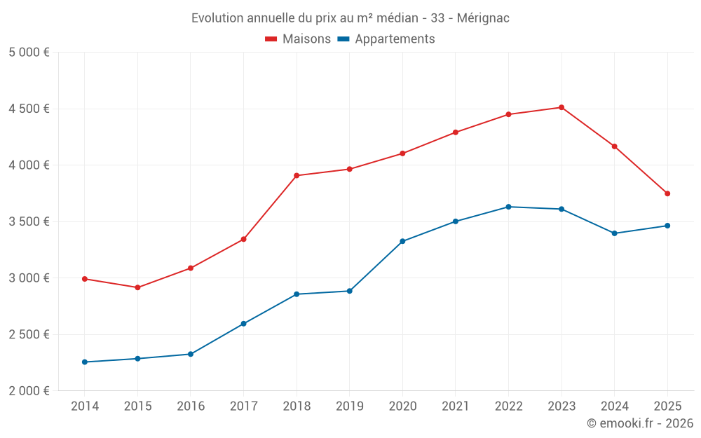 Le prix médian sur les 63 transactions de maisons des 3 derniers mois dans la commune de Mérignac était de 3 734 € par mètre carré pour une valeur foncière médiane de 388 000 €. Sur cette période 60% des transactions se sont situées entre 3 174 et 4 639 € par mètre carré (du 2ème au 8ème déciles).
