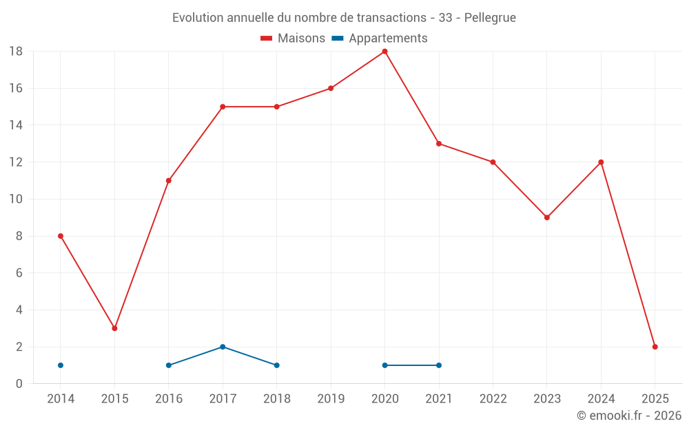 Le prix médian sur les 20 transactions de maisons des 24 derniers mois dans la commune de Pellegrue était de 1 161 € par mètre carré pour une valeur foncière médiane de 118 425 €. Sur cette période 60% des transactions se sont situées entre 594 et 1 470 € par mètre carré (du 2ème au 8ème déciles).