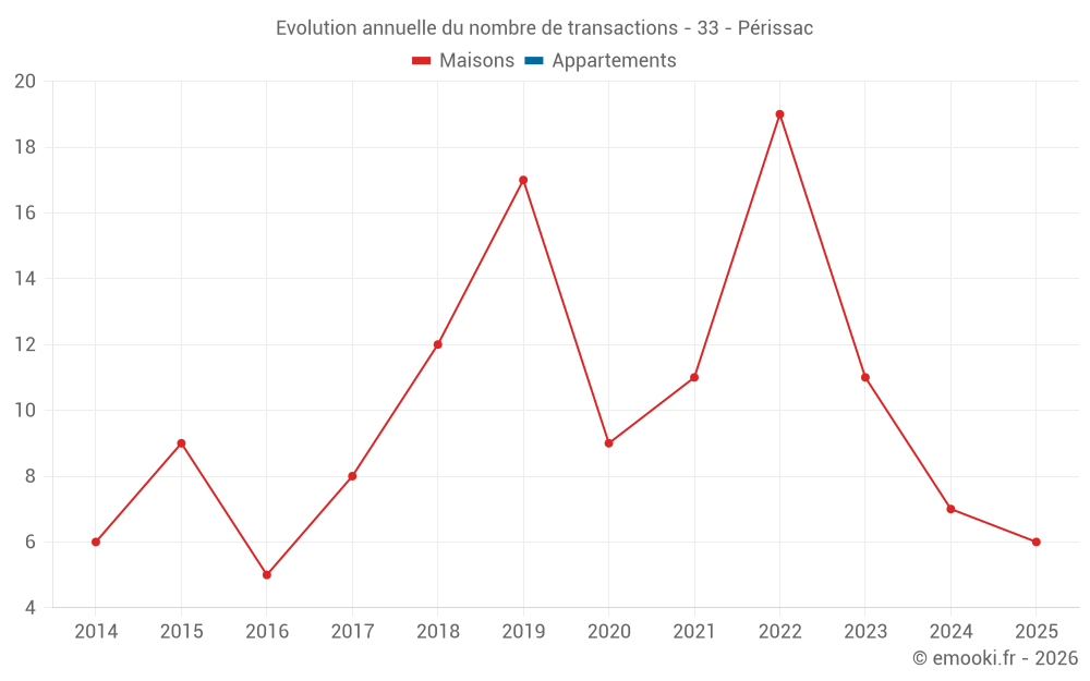 Le prix médian sur les 17 transactions de maisons des 24 derniers mois dans la commune de Périssac était de 2 370 € par mètre carré pour une valeur foncière médiane de 219 048 €. Sur cette période 60% des transactions se sont situées entre 1 704 et 3 129 € par mètre carré (du 2ème au 8ème déciles).
