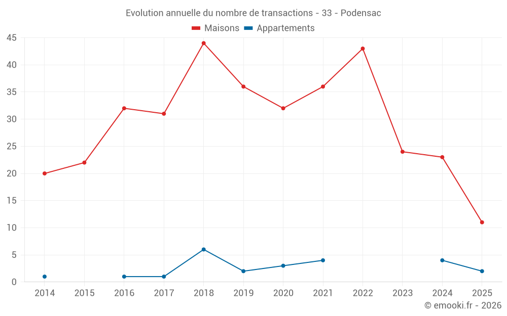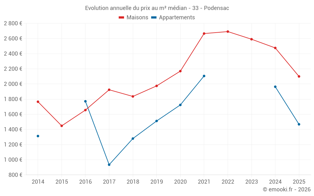 Le prix médian sur les 23 transactions de maisons des 12 derniers mois dans la commune de Podensac était de 2 400 € par mètre carré pour une valeur foncière médiane de 242 000 €. Sur cette période 60% des transactions se sont situées entre 1 413 et 3 049 € par mètre carré (du 2ème au 8ème déciles).