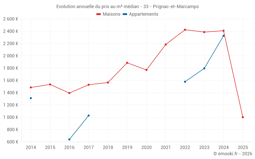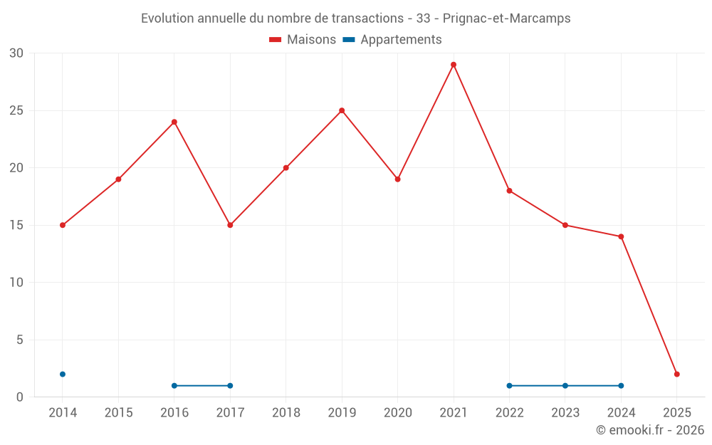 Le prix médian sur les 22 transactions de maisons des 24 derniers mois dans la commune de Prignac-et-Marcamps était de 2 378 € par mètre carré pour une valeur foncière médiane de 228 250 €. Sur cette période 60% des transactions se sont situées entre 2 017 et 2 817 € par mètre carré (du 2ème au 8ème déciles).