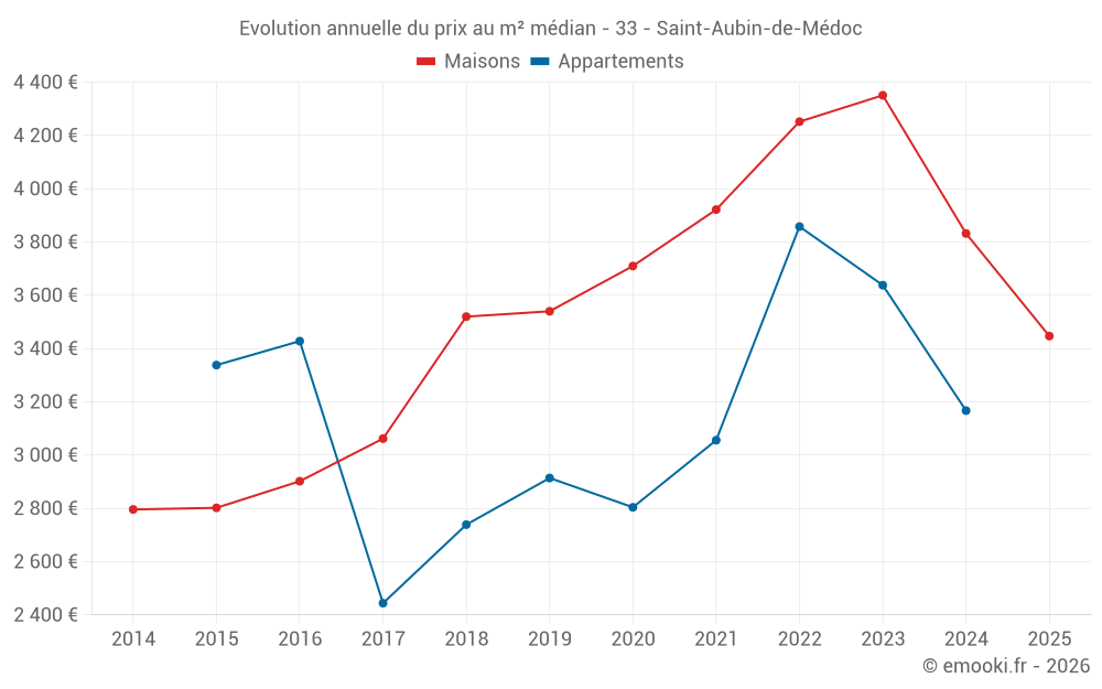 Le prix médian sur les 18 transactions de maisons des 6 derniers mois dans la commune de Saint-Aubin-de-Médoc était de 3 447 € par mètre carré pour une valeur foncière médiane de 417 000 €. Sur cette période 60% des transactions se sont situées entre 3 099 et 4 104 € par mètre carré (du 2ème au 8ème déciles).