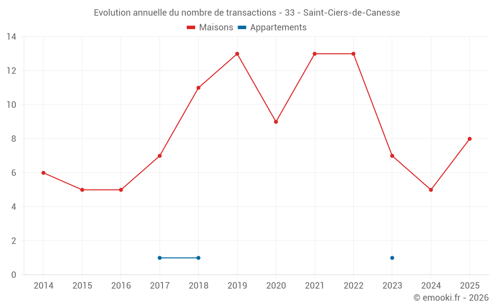 Le prix médian sur les 14 transactions de maisons des 24 derniers mois dans la commune de Saint-Ciers-de-Canesse était de 1 588 € par mètre carré pour une valeur foncière médiane de 197 500 €. Sur cette période 60% des transactions se sont situées entre 1 140 et 2 210 € par mètre carré (du 2ème au 8ème déciles).