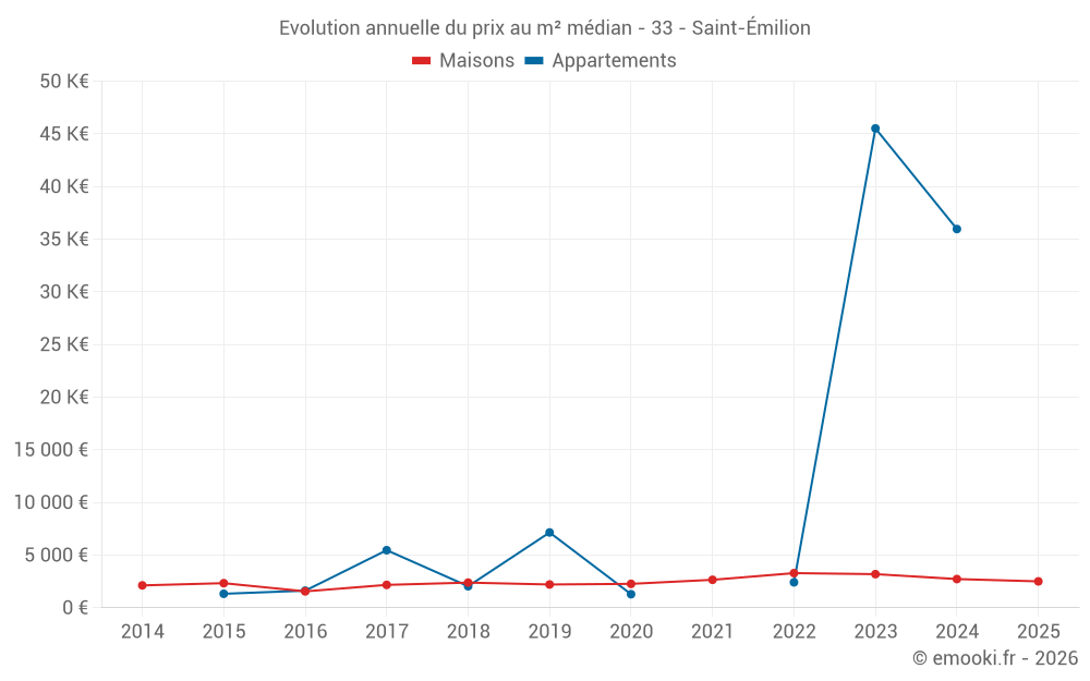 Le prix médian sur les 29 transactions de maisons des 24 derniers mois dans la commune de Saint-Émilion était de 2 350 € par mètre carré pour une valeur foncière médiane de 232 500 €. Sur cette période 60% des transactions se sont situées entre 1 534 et 4 057 € par mètre carré (du 2ème au 8ème déciles).