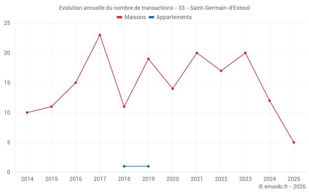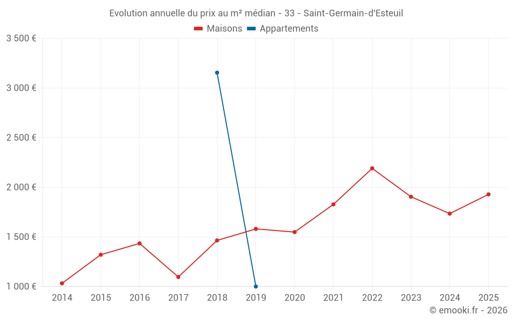 Le prix médian sur les 29 transactions de maisons des 24 derniers mois dans la commune de Saint-Germain-d'Esteuil était de 1 928 € par mètre carré pour une valeur foncière médiane de 181 350 €. Sur cette période 60% des transactions se sont situées entre 1 503 et 2 484 € par mètre carré (du 2ème au 8ème déciles).