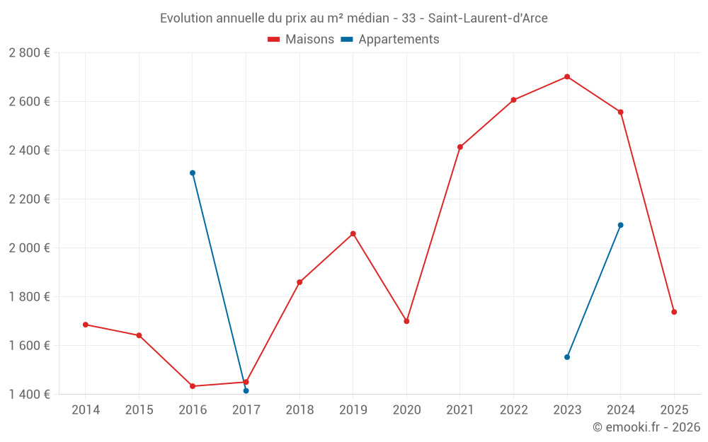 Le prix médian sur les 21 transactions de maisons des 24 derniers mois dans la commune de Saint-Laurent-d'Arce était de 2 557 € par mètre carré pour une valeur foncière médiane de 270 200 €. Sur cette période 60% des transactions se sont situées entre 1 738 et 2 897 € par mètre carré (du 2ème au 8ème déciles).