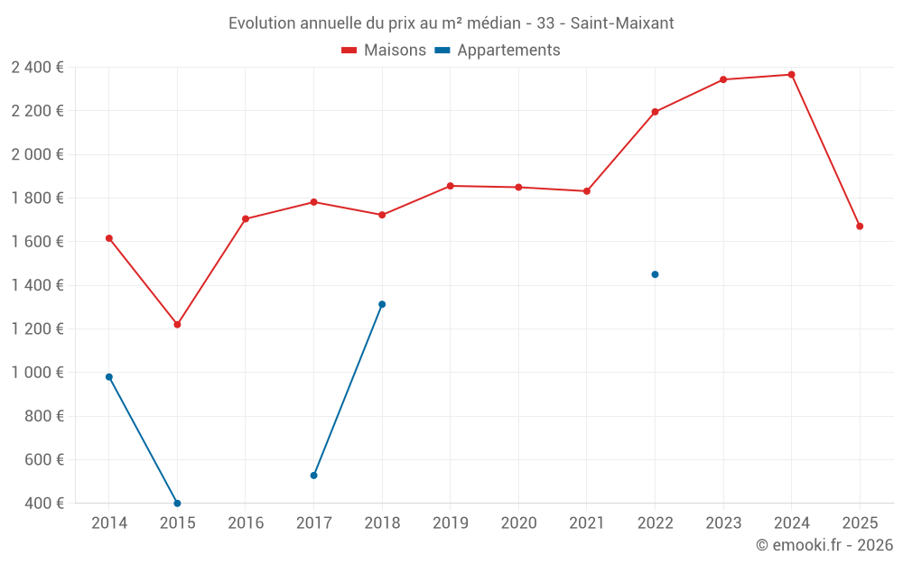 Le prix médian sur les 17 transactions de maisons des 12 derniers mois dans la commune de Saint-Maixant était de 2 281 € par mètre carré pour une valeur foncière médiane de 240 000 €. Sur cette période 60% des transactions se sont situées entre 2 050 et 2 839 € par mètre carré (du 2ème au 8ème déciles).