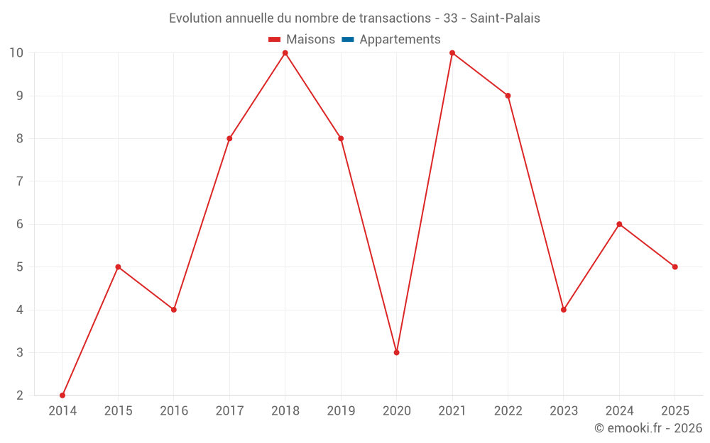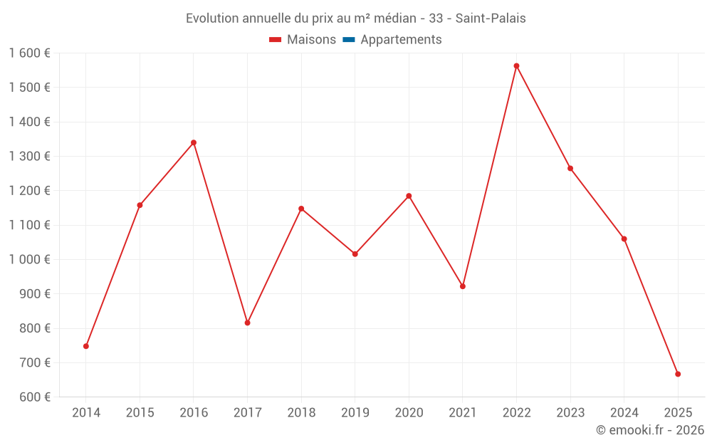 Le prix médian sur les 15 transactions de maisons des 24 derniers mois dans la commune de Saint-Palais était de 1 064 € par mètre carré pour une valeur foncière médiane de 95 000 €. Sur cette période 60% des transactions se sont situées entre 667 et 1 465 € par mètre carré (du 2ème au 8ème déciles).