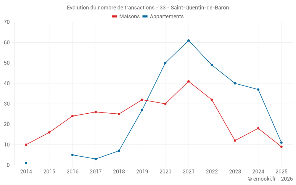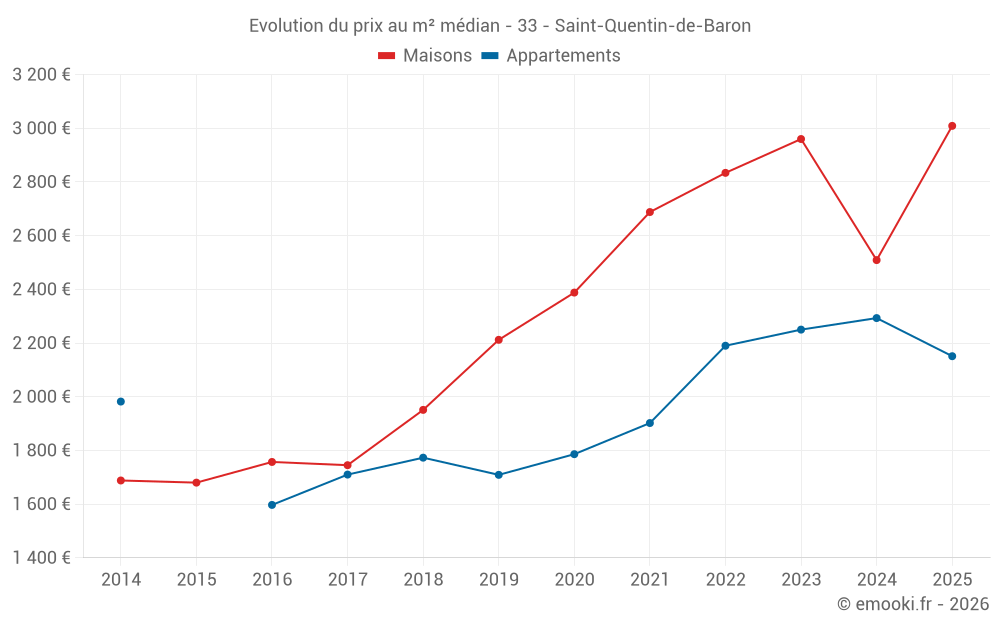 Le prix médian sur les 20 transactions de maisons des 12 derniers mois dans la commune de Saint-Quentin-de-Baron était de 2 592 € par mètre carré pour une valeur foncière médiane de 234 500 €. Sur cette période 60% des transactions se sont situées entre 2 030 et 3 324 € par mètre carré (du 2ème au 8ème déciles).