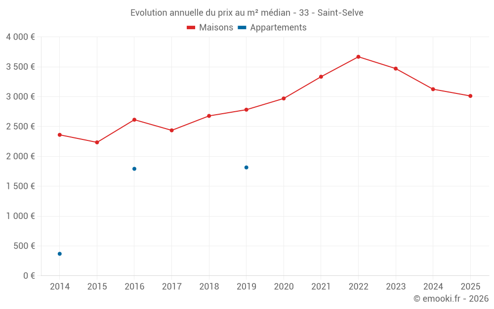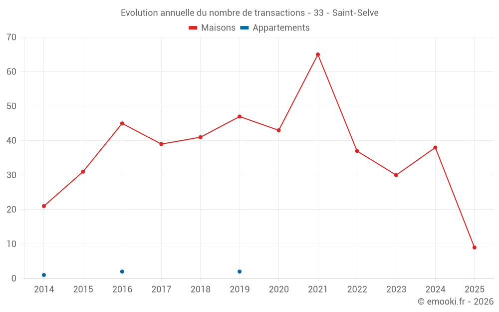 Le prix médian sur les 31 transactions de maisons des 12 derniers mois dans la commune de Saint-Selve était de 3 056 € par mètre carré pour une valeur foncière médiane de 320 000 €. Sur cette période 60% des transactions se sont situées entre 2 315 et 3 393 € par mètre carré (du 2ème au 8ème déciles).