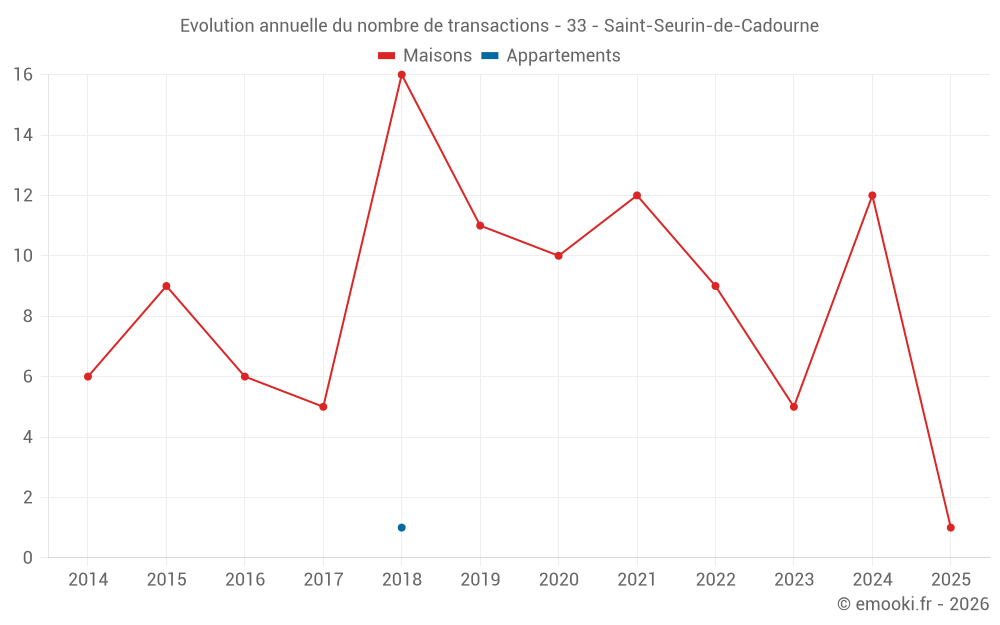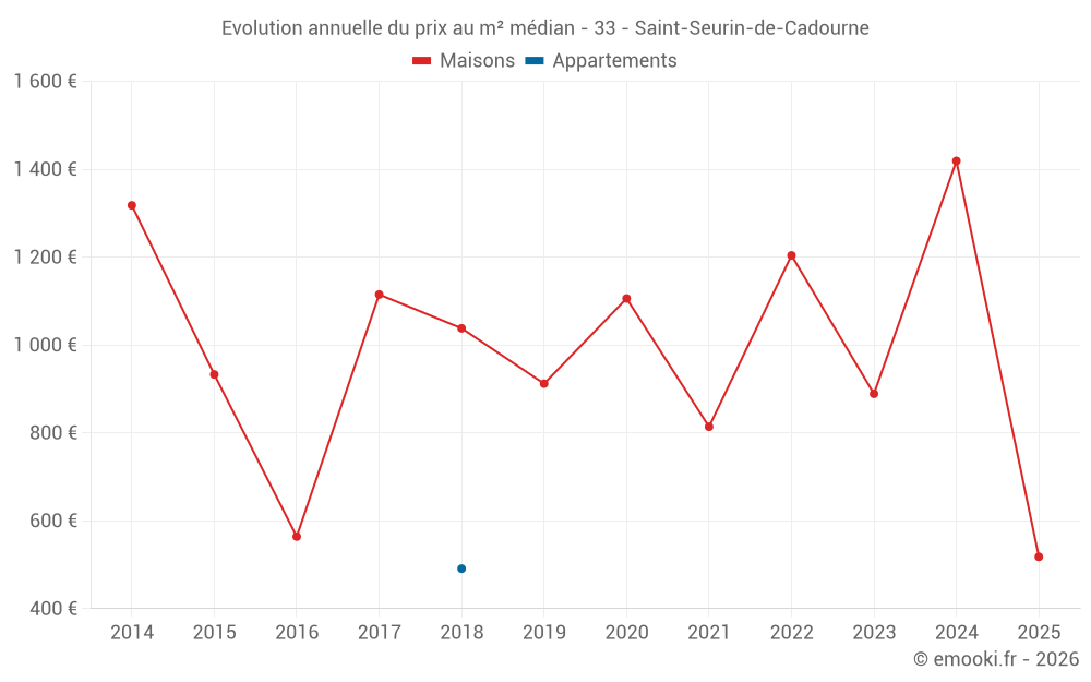 Le prix médian sur les 17 transactions de maisons des 24 derniers mois dans la commune de Saint-Seurin-de-Cadourne était de 1 294 € par mètre carré pour une valeur foncière médiane de 150 000 €. Sur cette période 60% des transactions se sont situées entre 863 et 2 067 € par mètre carré (du 2ème au 8ème déciles).