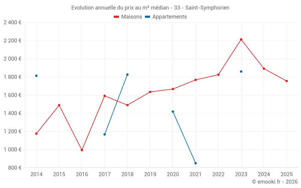 Le prix médian sur les 19 transactions de maisons des 12 derniers mois dans la commune de Saint-Symphorien était de 1 885 € par mètre carré pour une valeur foncière médiane de 190 000 €. Sur cette période 60% des transactions se sont situées entre 1 458 et 2 964 € par mètre carré (du 2ème au 8ème déciles).