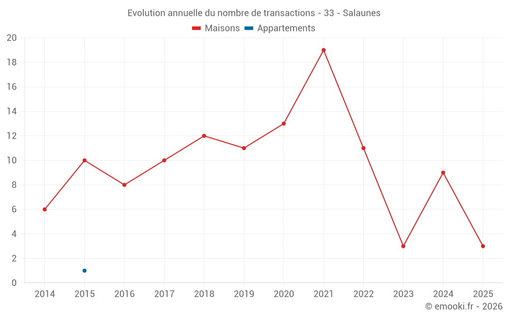 Le prix médian sur les 15 transactions de maisons des 24 derniers mois dans la commune de Salaunes était de 3 554 € par mètre carré pour une valeur foncière médiane de 398 000 €. Sur cette période 60% des transactions se sont situées entre 3 099 et 4 188 € par mètre carré (du 2ème au 8ème déciles).