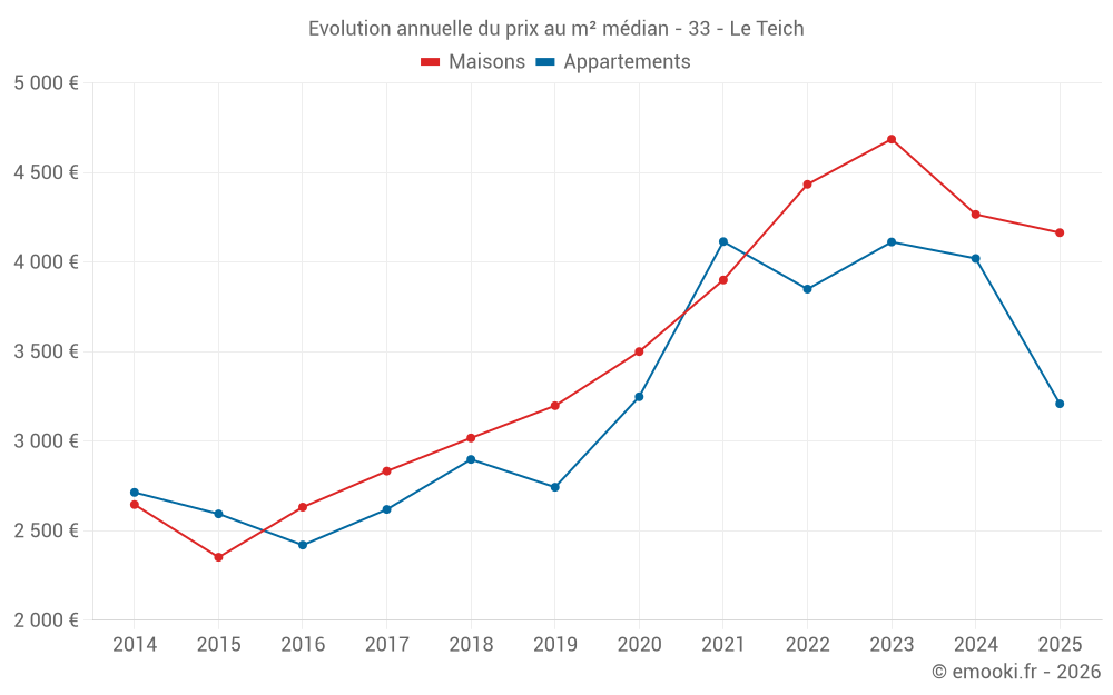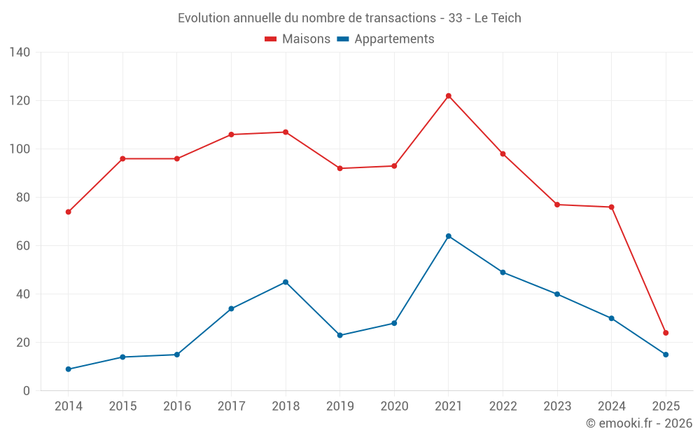 Le prix médian sur les 24 transactions de maisons des 6 derniers mois dans la commune du Teich était de 4 164 € par mètre carré pour une valeur foncière médiane de 440 875 €. Sur cette période 60% des transactions se sont situées entre 3 305 et 4 692 € par mètre carré (du 2ème au 8ème déciles).
