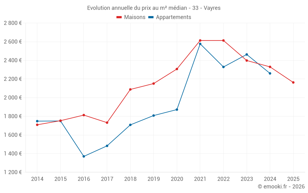 Le prix médian sur les 27 transactions de maisons des 6 derniers mois dans la commune de Vayres était de 2 163 € par mètre carré pour une valeur foncière médiane de 255 000 €. Sur cette période 60% des transactions se sont situées entre 1 324 et 2 769 € par mètre carré (du 2ème au 8ème déciles).