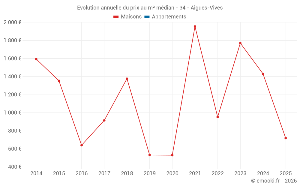 Le prix médian sur les 23 transactions de maisons des 24 derniers mois dans la commune d'Aigues-Vives était de 1 424 € par mètre carré pour une valeur foncière médiane de 94 000 €. Sur cette période 60% des transactions se sont situées entre 570 et 1 879 € par mètre carré (du 2ème au 8ème déciles).