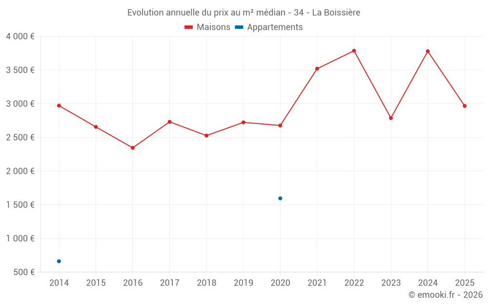 Le prix médian sur les 17 transactions de maisons des 24 derniers mois dans la commune de la Boissière était de 3 385 € par mètre carré pour une valeur foncière médiane de 394 700 €. Sur cette période 60% des transactions se sont situées entre 2 633 et 4 177 € par mètre carré (du 2ème au 8ème déciles).