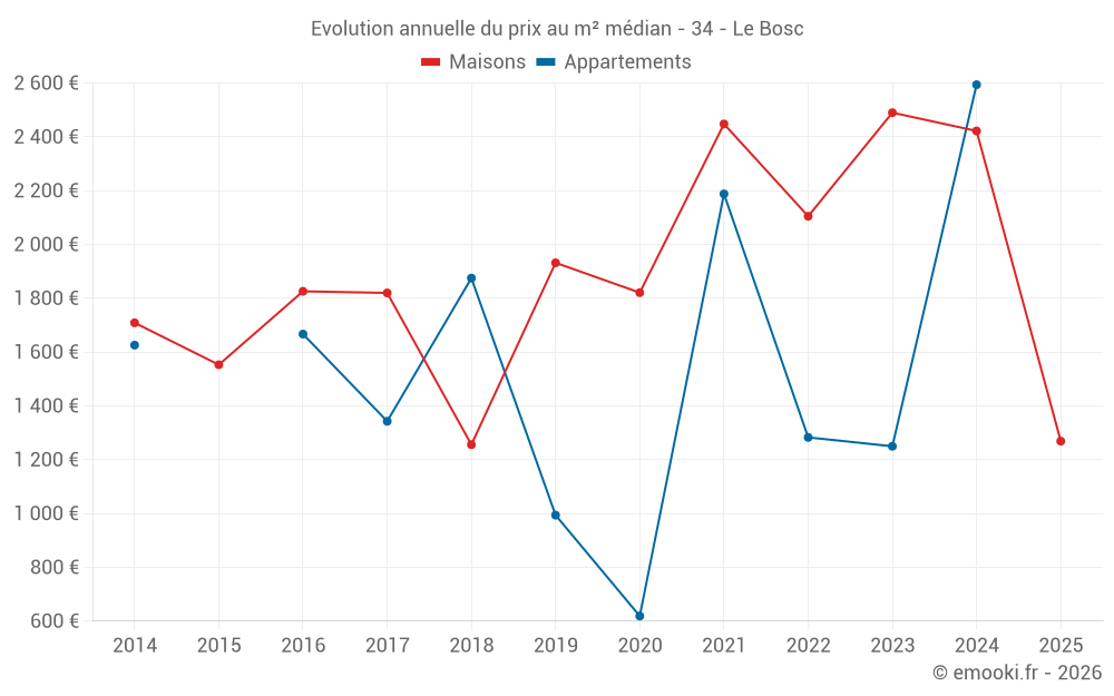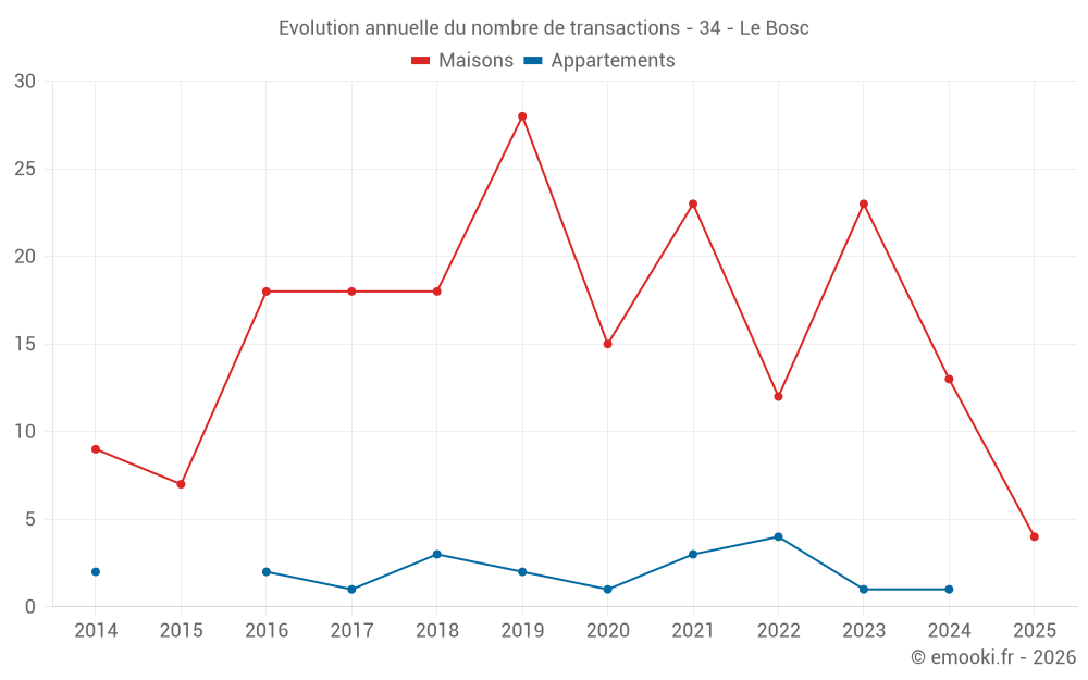 Le prix médian sur les 28 transactions de maisons des 24 derniers mois dans la commune du Bosc était de 2 220 € par mètre carré pour une valeur foncière médiane de 231 500 €. Sur cette période 60% des transactions se sont situées entre 757 et 2 844 € par mètre carré (du 2ème au 8ème déciles).
