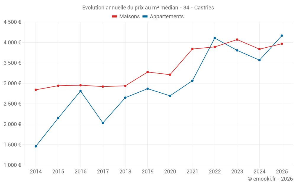 Le prix médian sur les 49 transactions de maisons des 12 derniers mois dans la commune de Castries était de 3 843 € par mètre carré pour une valeur foncière médiane de 409 000 €. Sur cette période 60% des transactions se sont situées entre 3 295 et 4 822 € par mètre carré (du 2ème au 8ème déciles).