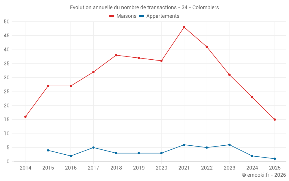 Le prix médian sur les 27 transactions de maisons des 12 derniers mois dans la commune de Colombiers était de 2 783 € par mètre carré pour une valeur foncière médiane de 239 500 €. Sur cette période 60% des transactions se sont situées entre 2 019 et 3 139 € par mètre carré (du 2ème au 8ème déciles).