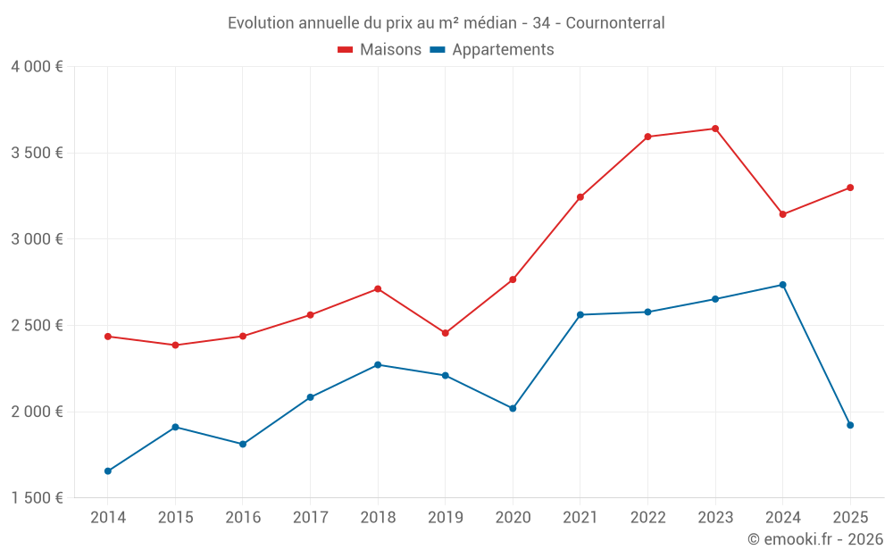 Le prix médian sur les 24 transactions de maisons des 6 derniers mois dans la commune de Cournonterral était de 3 299 € par mètre carré pour une valeur foncière médiane de 338 650 €. Sur cette période 60% des transactions se sont situées entre 2 832 et 3 704 € par mètre carré (du 2ème au 8ème déciles).