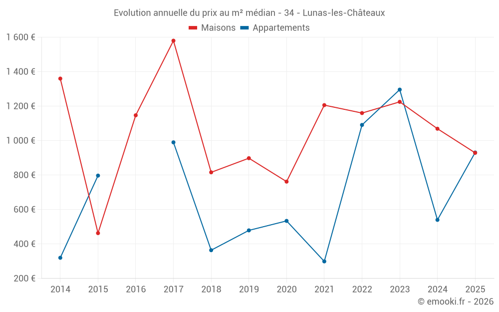 Le prix médian sur les 20 transactions de maisons des 24 derniers mois dans la commune de Lunas-les-Châteaux était de 1 092 € par mètre carré pour une valeur foncière médiane de 88 500 €. Sur cette période 60% des transactions se sont situées entre 757 et 2 044 € par mètre carré (du 2ème au 8ème déciles).