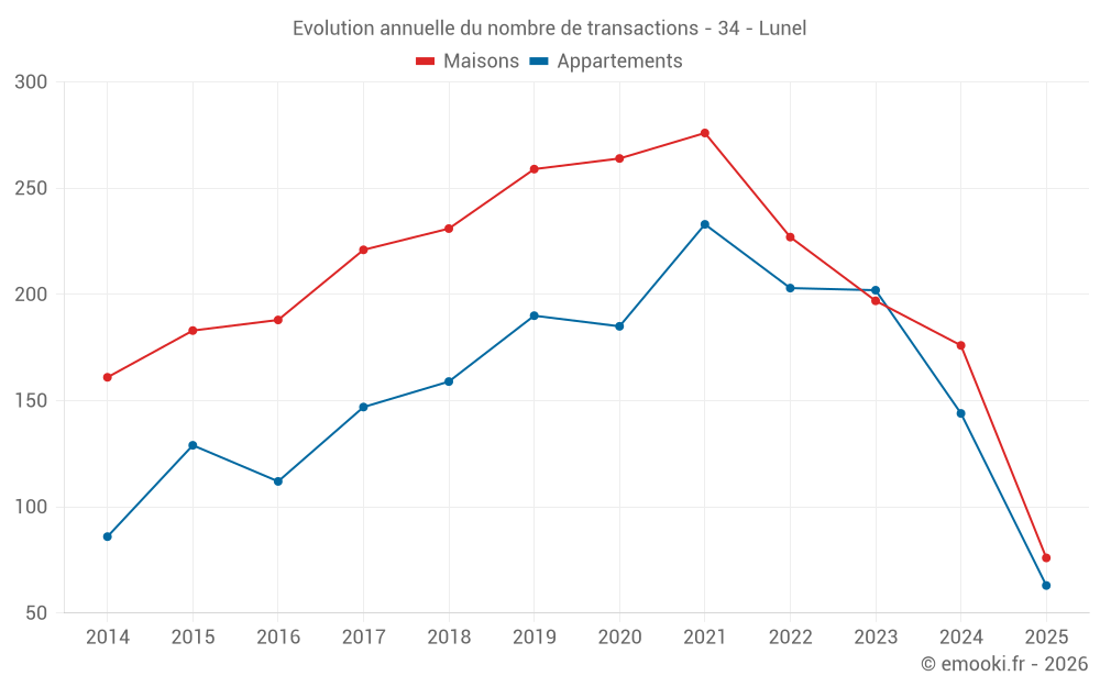 Le prix médian sur les 28 transactions de maisons des 3 derniers mois dans la commune de Lunel était de 2 862 € par mètre carré pour une valeur foncière médiane de 259 500 €. Sur cette période 60% des transactions se sont situées entre 1 962 et 3 523 € par mètre carré (du 2ème au 8ème déciles).