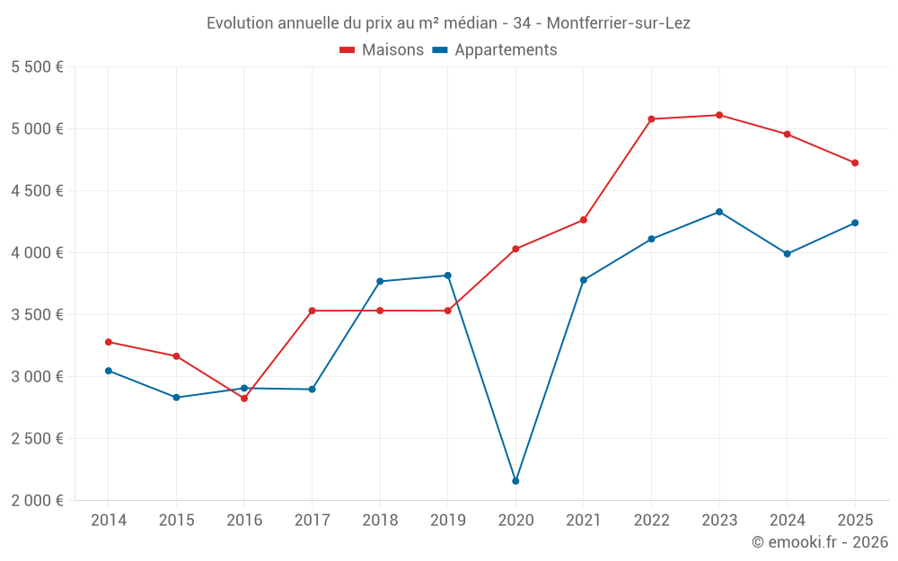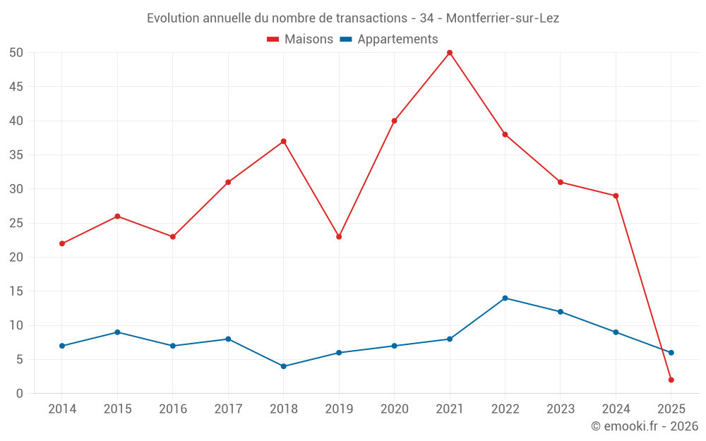 Le prix médian sur les 19 transactions de maisons des 12 derniers mois dans la commune de Montferrier-sur-Lez était de 4 303 € par mètre carré pour une valeur foncière médiane de 600 000 €. Sur cette période 60% des transactions se sont situées entre 3 460 et 5 236 € par mètre carré (du 2ème au 8ème déciles).