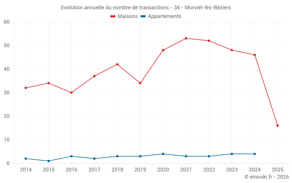 Le prix médian sur les 41 transactions de maisons des 12 derniers mois dans la commune de Murviel-lès-Béziers était de 1 774 € par mètre carré pour une valeur foncière médiane de 170 250 €. Sur cette période 60% des transactions se sont situées entre 1 189 et 2 466 € par mètre carré (du 2ème au 8ème déciles).