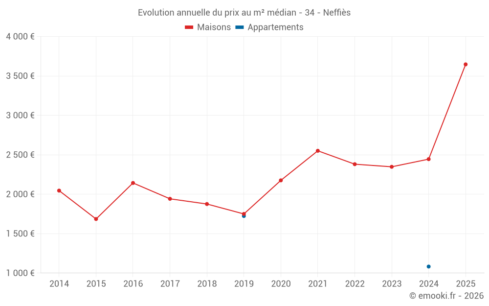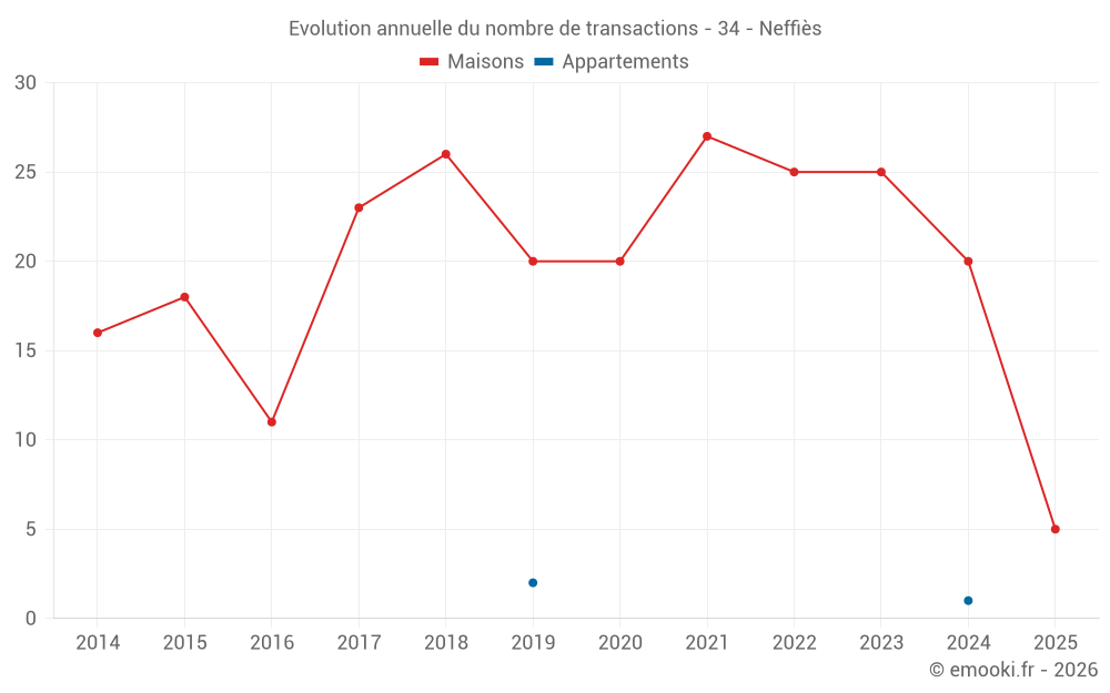 Le prix médian sur les 16 transactions de maisons des 12 derniers mois dans la commune de Neffiès était de 3 220 € par mètre carré pour une valeur foncière médiane de 239 838 €. Sur cette période 60% des transactions se sont situées entre 2 248 et 4 000 € par mètre carré (du 2ème au 8ème déciles).