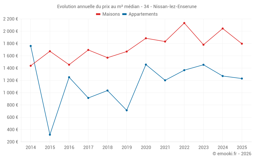 Le prix médian sur les 20 transactions de maisons des 6 derniers mois dans la commune de Nissan-lez-Enserune était de 1 798 € par mètre carré pour une valeur foncière médiane de 209 635 €. Sur cette période 60% des transactions se sont situées entre 1 377 et 2 846 € par mètre carré (du 2ème au 8ème déciles).