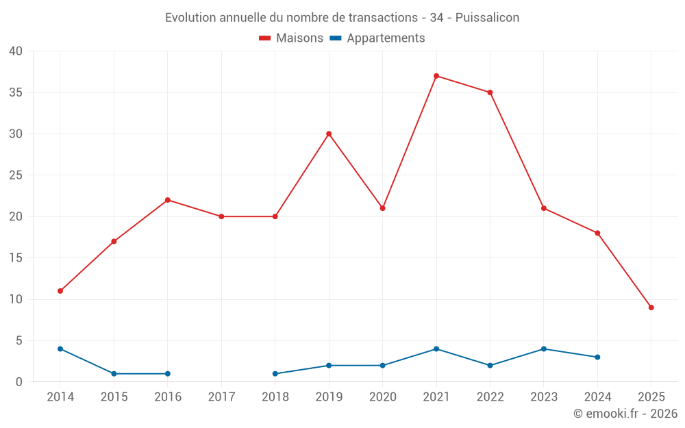 Le prix médian sur les 19 transactions de maisons des 12 derniers mois dans la commune de Puissalicon était de 1 633 € par mètre carré pour une valeur foncière médiane de 145 000 €. Sur cette période 60% des transactions se sont situées entre 810 et 2 237 € par mètre carré (du 2ème au 8ème déciles).