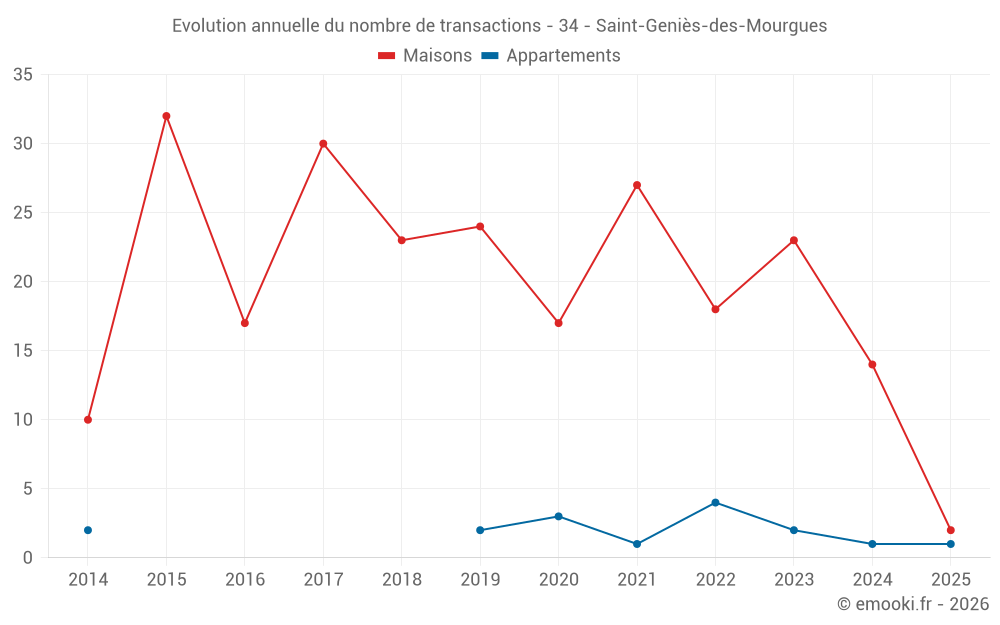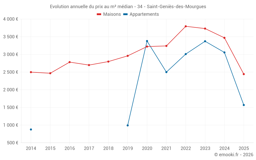 Le prix médian sur les 30 transactions de maisons des 24 derniers mois dans la commune de Saint-Geniès-des-Mourgues était de 3 672 € par mètre carré pour une valeur foncière médiane de 353 500 €. Sur cette période 60% des transactions se sont situées entre 2 467 et 4 245 € par mètre carré (du 2ème au 8ème déciles).