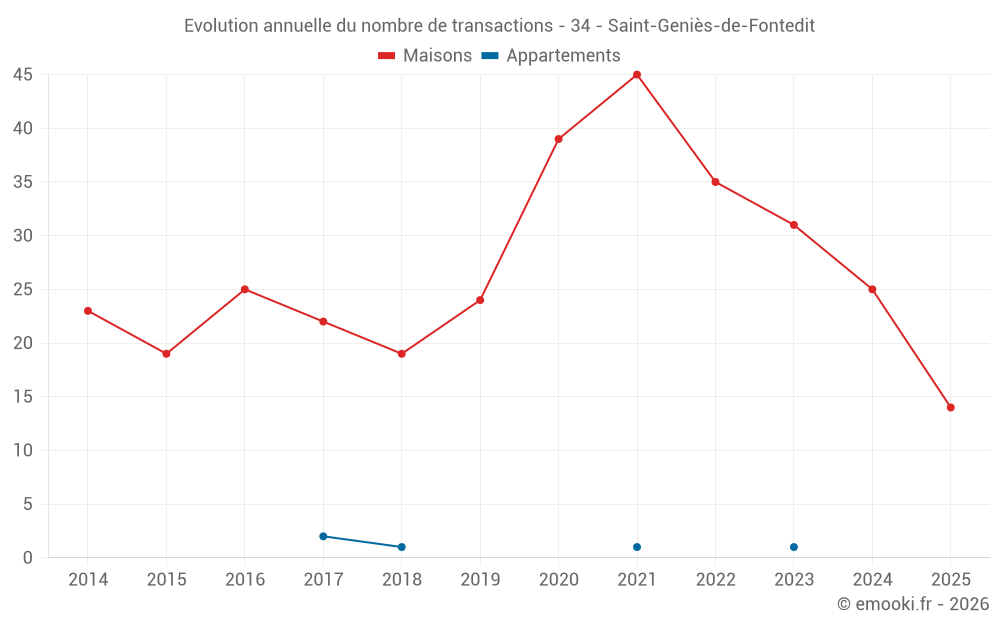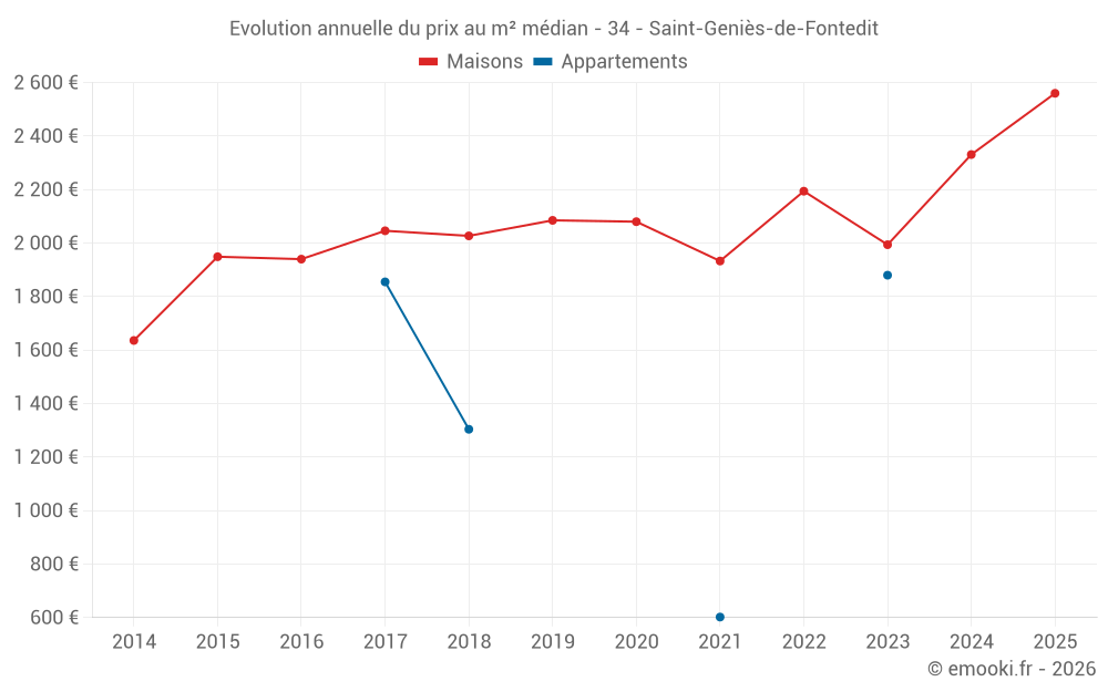 Le prix médian sur les 30 transactions de maisons des 12 derniers mois dans la commune de Saint-Geniès-de-Fontedit était de 2 572 € par mètre carré pour une valeur foncière médiane de 234 500 €. Sur cette période 60% des transactions se sont situées entre 1 160 et 3 276 € par mètre carré (du 2ème au 8ème déciles).