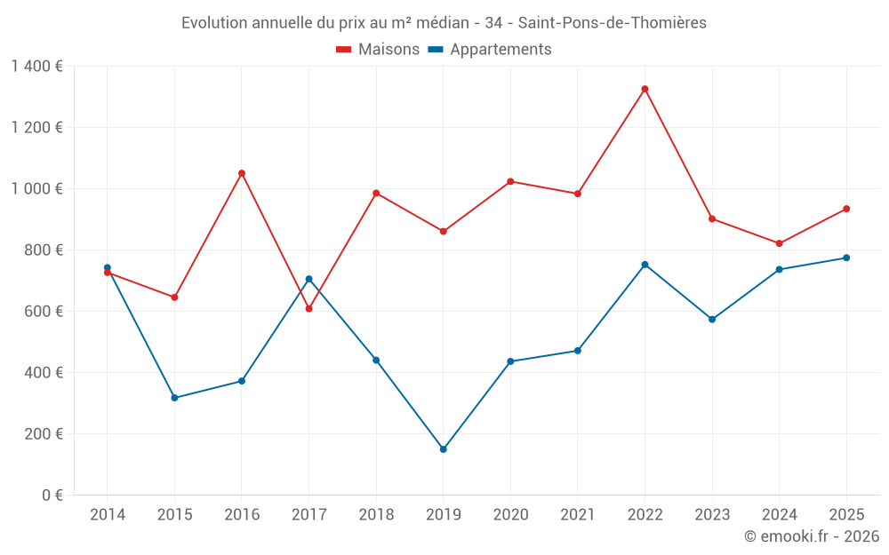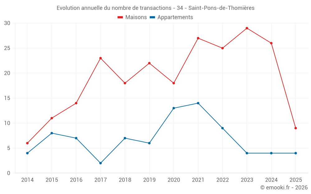 Le prix médian sur les 24 transactions de maisons des 12 derniers mois dans la commune de Saint-Pons-de-Thomières était de 992 € par mètre carré pour une valeur foncière médiane de 64 755 €. Sur cette période 60% des transactions se sont situées entre 591 et 1 694 € par mètre carré (du 2ème au 8ème déciles).