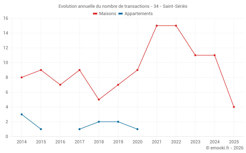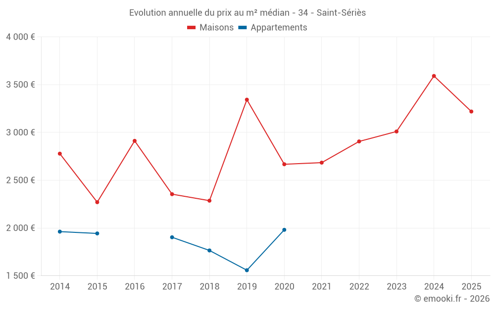 Le prix médian sur les 24 transactions de maisons des 24 derniers mois dans la commune de Saint-Sériès était de 3 311 € par mètre carré pour une valeur foncière médiane de 354 565 €. Sur cette période 60% des transactions se sont situées entre 2 223 et 4 265 € par mètre carré (du 2ème au 8ème déciles).