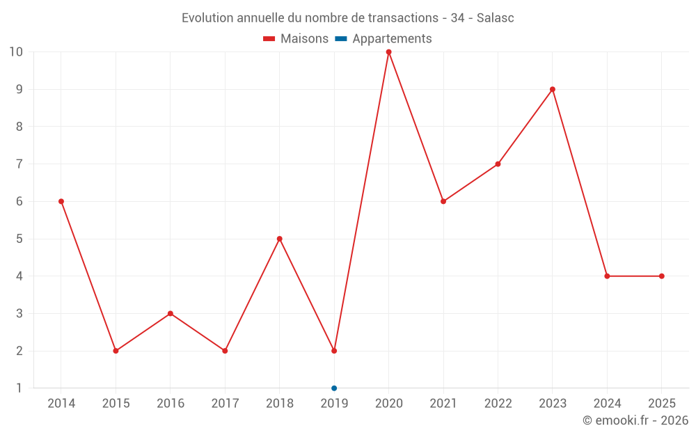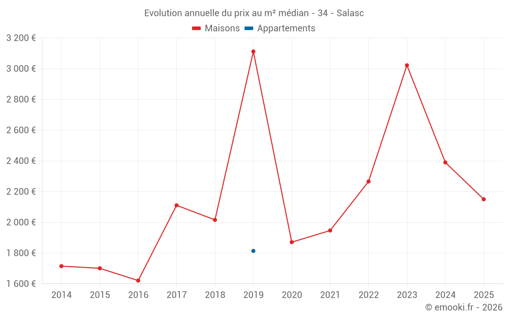 Le prix médian sur les 14 transactions de maisons des 24 derniers mois dans la commune de Salasc était de 2 312 € par mètre carré pour une valeur foncière médiane de 233 900 €. Sur cette période 60% des transactions se sont situées entre 1 146 et 2 981 € par mètre carré (du 2ème au 8ème déciles).