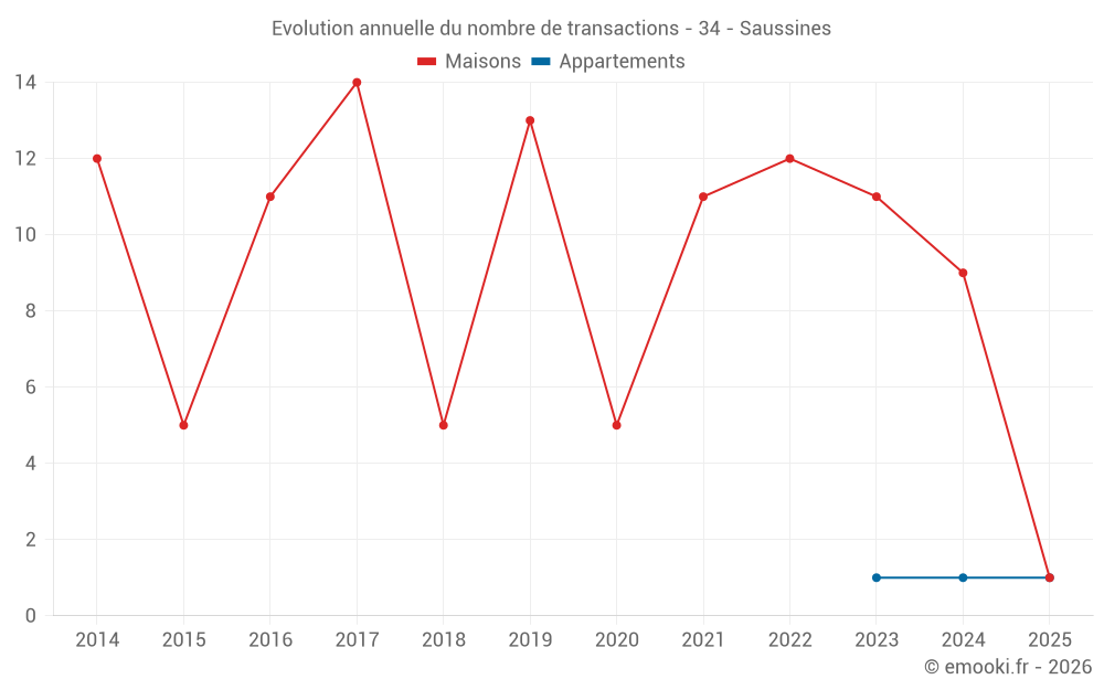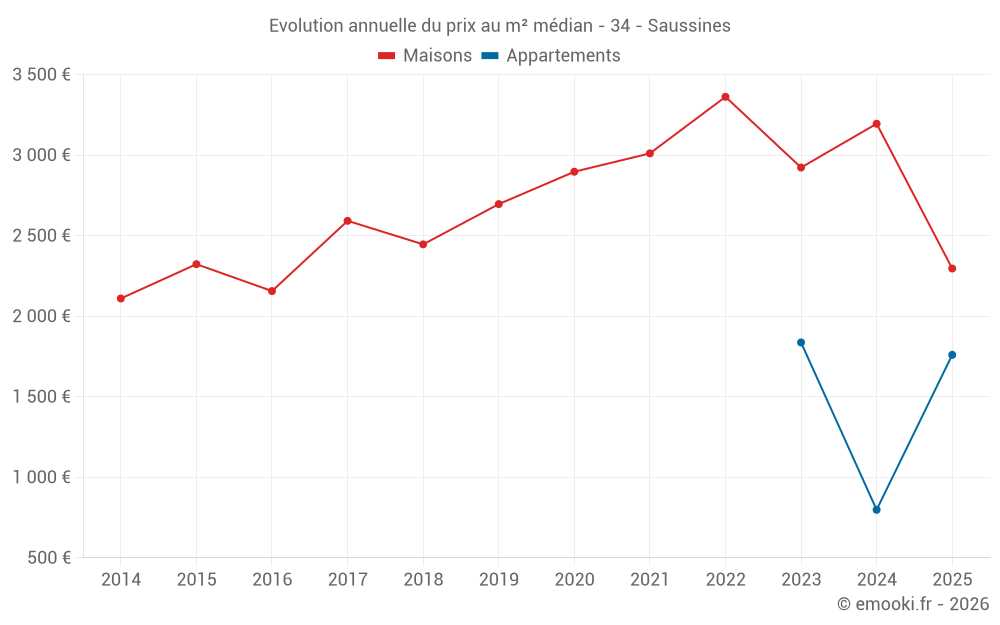 Le prix médian sur les 16 transactions de maisons des 24 derniers mois dans la commune de Saussines était de 2 840 € par mètre carré pour une valeur foncière médiane de 290 975 €. Sur cette période 60% des transactions se sont situées entre 56 et 3 782 € par mètre carré (du 2ème au 8ème déciles).