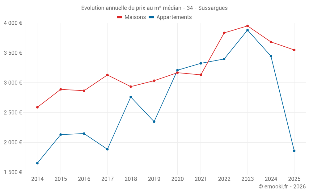 Le prix médian sur les 34 transactions de maisons des 24 derniers mois dans la commune de Sussargues était de 3 823 € par mètre carré pour une valeur foncière médiane de 408 825 €. Sur cette période 60% des transactions se sont situées entre 2 827 et 4 366 € par mètre carré (du 2ème au 8ème déciles).