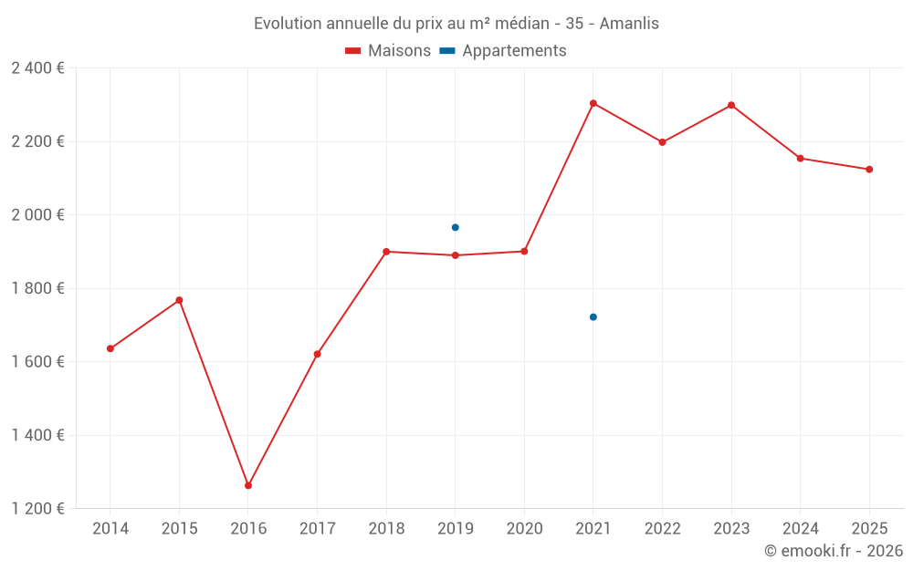 Le prix médian sur les 24 transactions de maisons des 24 derniers mois dans la commune d'Amanlis était de 2 180 € par mètre carré pour une valeur foncière médiane de 219 518 €. Sur cette période 60% des transactions se sont situées entre 1 685 et 2 760 € par mètre carré (du 2ème au 8ème déciles).