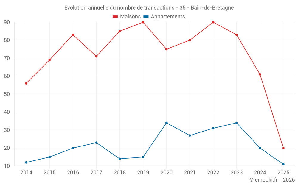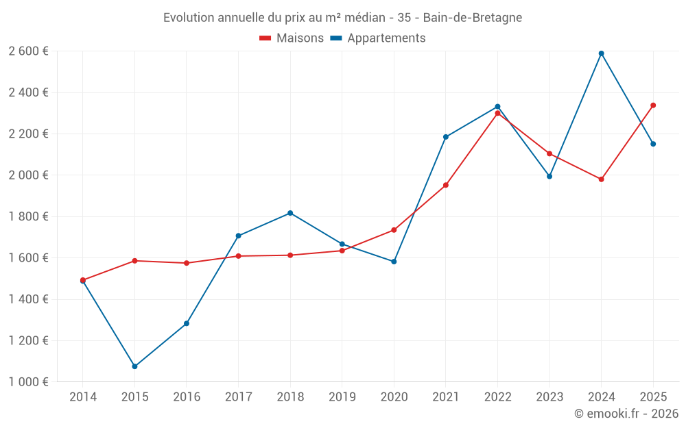 Le prix médian sur les 20 transactions de maisons des 6 derniers mois dans la commune de Bain-de-Bretagne était de 2 338 € par mètre carré pour une valeur foncière médiane de 202 500 €. Sur cette période 60% des transactions se sont situées entre 1 733 et 2 745 € par mètre carré (du 2ème au 8ème déciles).