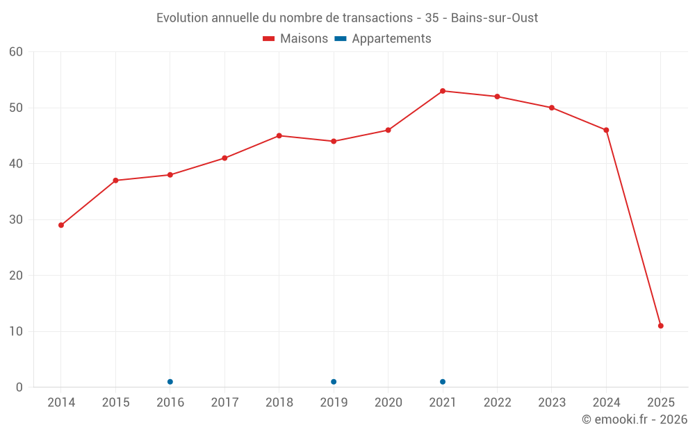 Le prix médian sur les 33 transactions de maisons des 12 derniers mois dans la commune de Bains-sur-Oust était de 1 733 € par mètre carré pour une valeur foncière médiane de 175 000 €. Sur cette période 60% des transactions se sont situées entre 1 232 et 2 269 € par mètre carré (du 2ème au 8ème déciles).