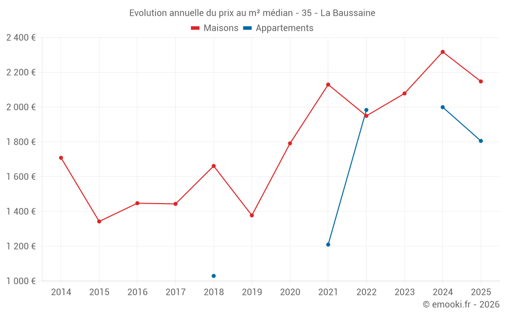 Le prix médian sur les 18 transactions de maisons des 24 derniers mois dans la commune de la Baussaine était de 2 164 € par mètre carré pour une valeur foncière médiane de 216 000 €. Sur cette période 60% des transactions se sont situées entre 1 702 et 2 538 € par mètre carré (du 2ème au 8ème déciles).