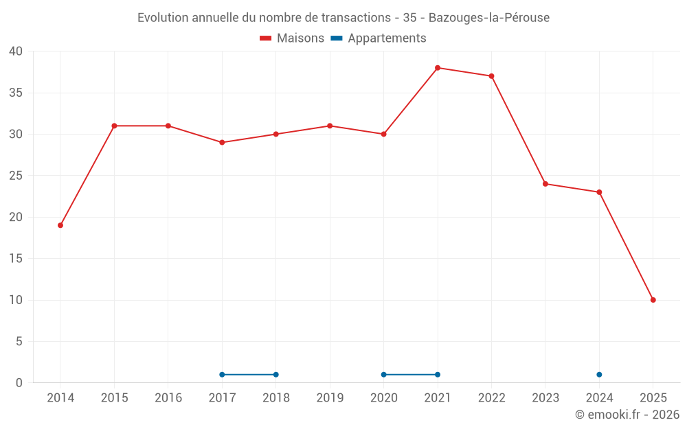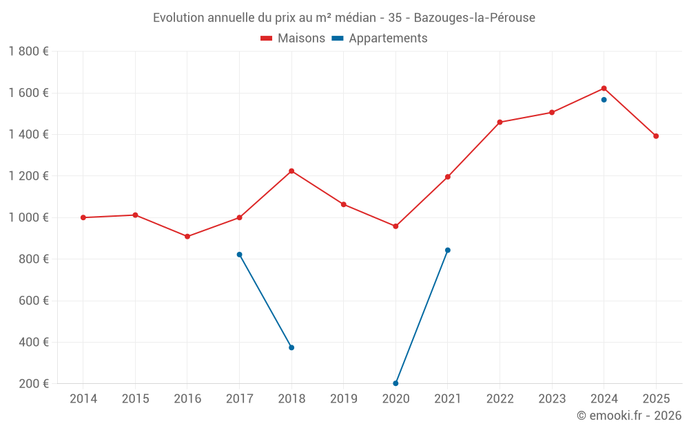 Le prix médian sur les 20 transactions de maisons des 12 derniers mois dans la commune de Bazouges-la-Pérouse était de 1 328 € par mètre carré pour une valeur foncière médiane de 120 000 €. Sur cette période 60% des transactions se sont situées entre 924 et 1 960 € par mètre carré (du 2ème au 8ème déciles).